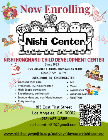 The Nishi Center provides daycare services for preschool to kindergarten-aged children from 2.9 to 6 years old. Nishi Center is a state-licensed day care center that was established in 1983. The school was established for the Nikkei/Buddhist community in order to: